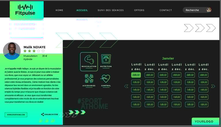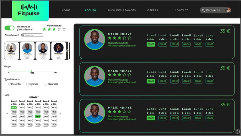 FitPulse est une application web responsive dédiée au sport et au bien-être, conçue pour répondre aux besoins d'un public jeune et actif. Son objectif principal est de faciliter l'accès aux services de coaching sportif, qu'il s'agisse de personnes en déplacement ou de celles souhaitant trouver des coachs près de chez elles. FitPulse connecte les utilisateurs à des professionnels du sport qualifiés pour proposer des séances adaptées à leurs besoins et à leur mode de vie.